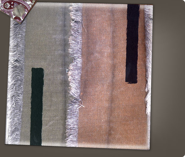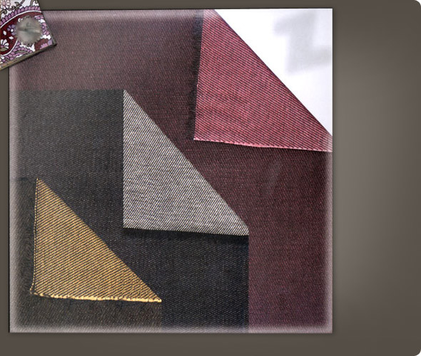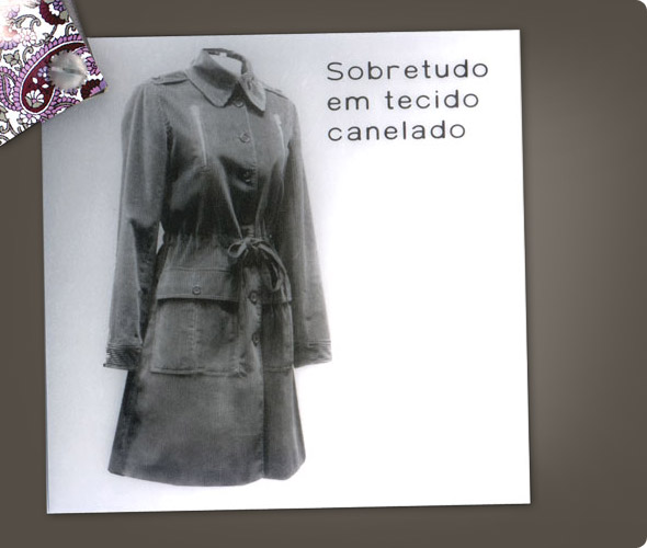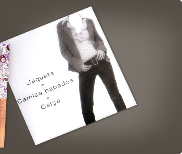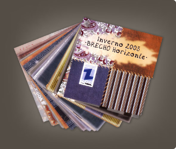 O MIX DE PRODUTOS da empresa foi apresentado no formato de um “leque”, onde lâminas em papel vegetal com fotos dos modelos sugeridos, sobrepõem os tecidos.